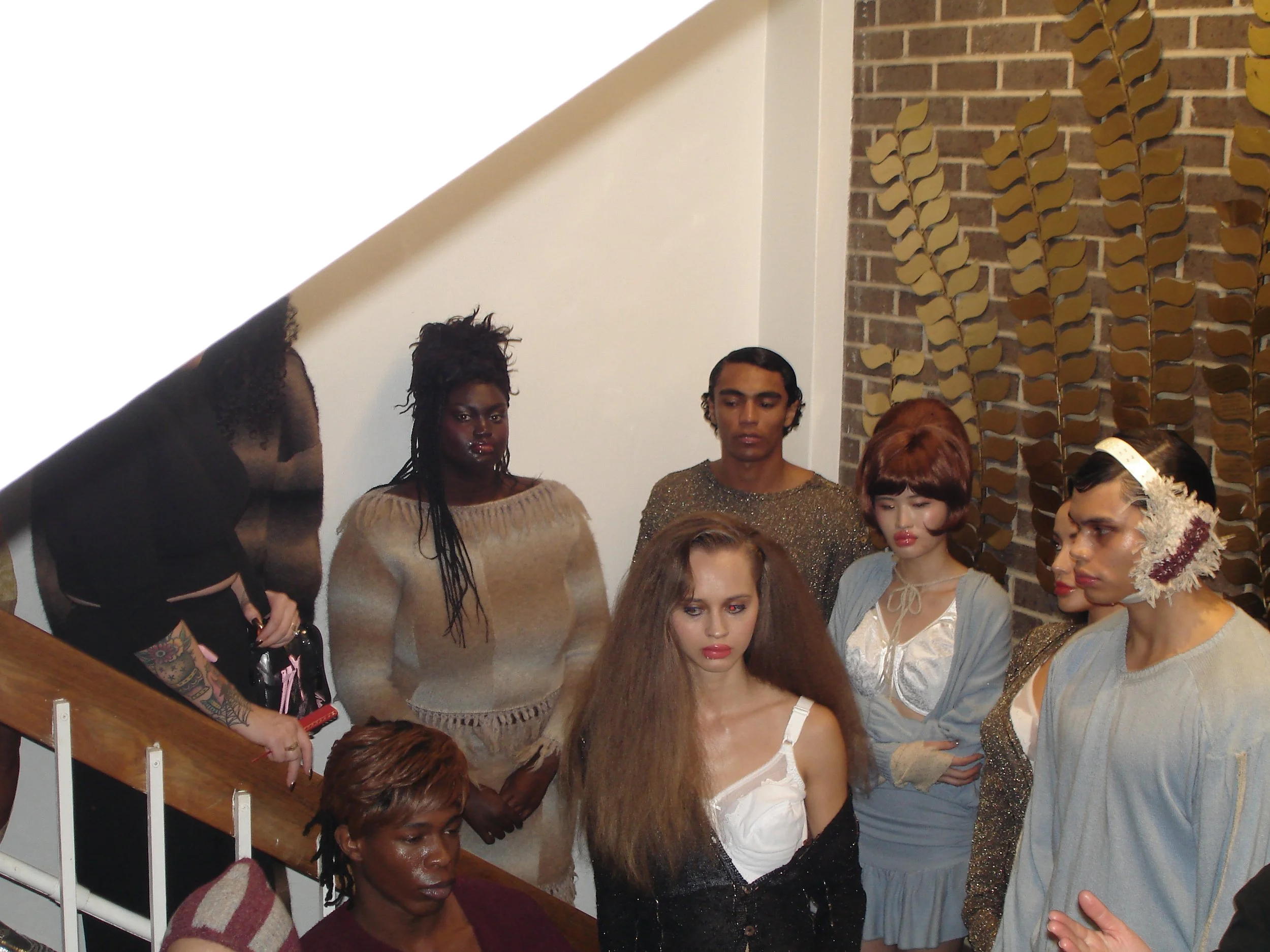 The collection and presentation are reminiscent of a dreamlike, idealized fantasy surrounding the typical American high school experience. Voyeuristic projections of wrestlers grappling with each other and impassioned cheerleaders performing their routines illuminated the walls and floors of the venue. A soft haze of smoke filled the room, intertwined with a surrealistic soundtrack that induced a romantic stupor upon the audience. Doll-like, plump lips and glossy skin confront the age-old question of what exactly constitutes beauty. Is it perfection? Can perfection even be attained? Or is it simply an illusion—a mirage in the oasis of life?
